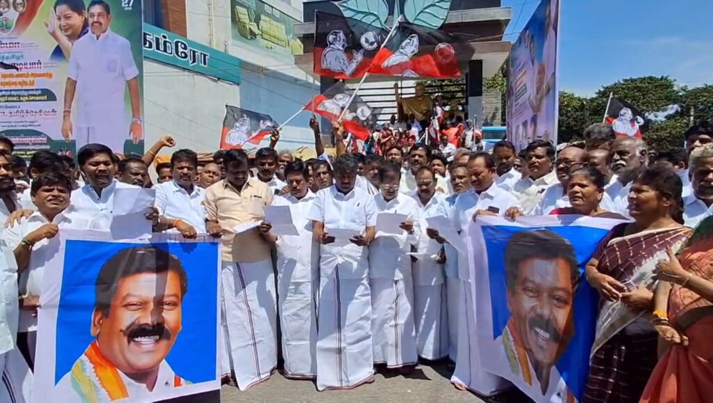 பெரம்பலூரில் காங்கிரஸ் மாநிலத் தலைவர் செல்வப் பெருந்தகை கண்டித்து அதிமுகவினர் நடத்திய ஆர்ப்பாட்டத்தின் போது செல்வ பெருந்தகையின் உருவப்படத்தை செருப்பால் அடித்து தீயிட்டு கொளுத்தியதால் பரபரப்பு ஏற்பட்டது.