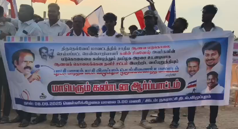 திருநெல்வேலி மாவட்டத்தில் மென்பொறியாளாளர் கவின் நிவினேஷை படுகொலை செய்ததை கண்டித்து ஆணவ கொலைகென தனி சட்டத்தை இயற்ற வலியுறுத்தி புரட்சி பாரதம் கட்சியின் சார்பில் கண்டன ஆர்ப்பாட்டம் நடைபெற்றது