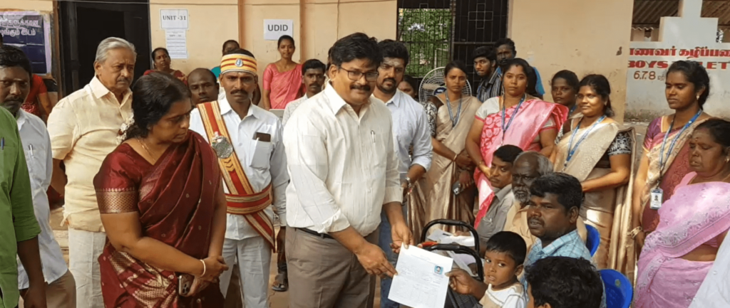 திருவாரூரில் நடைபெற்ற நலம் காக்கும் ஸ்டாலின் உயர் மருத்துவ சேவை முகாமில் மாற்றுத்திறனாளிகளுக்கு தேசிய அடையாள அட்டையிணை திருவாரூர் மாவட்ட ஆட்சியர் மோகனச்சந்திரன் வழங்கினார்.