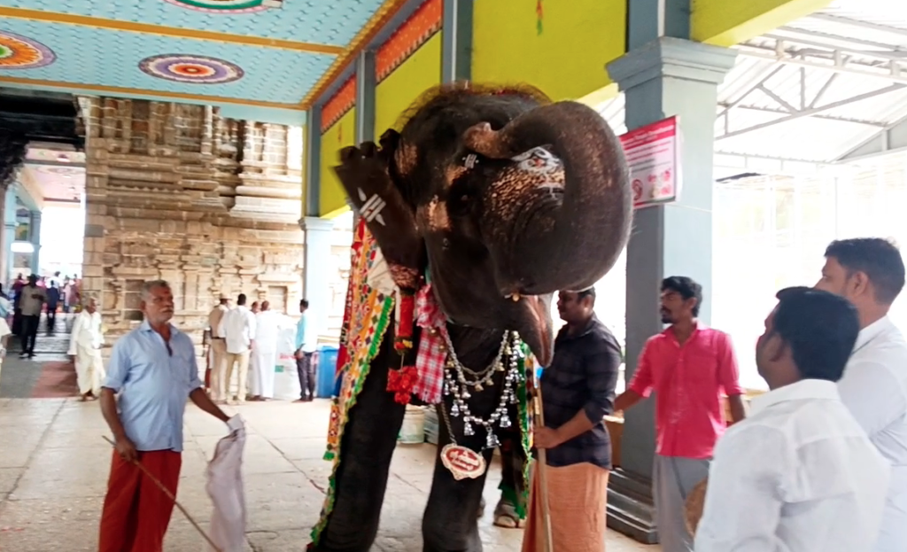 உலக யானைகள் தினம் திருக்கடையூர் கோவிலில் சிறப்பு பூஜைகள் செய்து பாசமுடன் வாழ்த்து யானையும் மகிழ்ச்சி