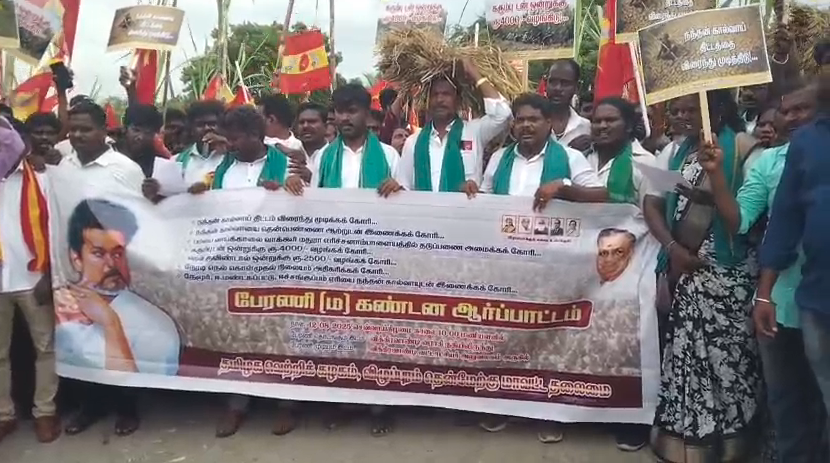 தென்மேற்கு மாவட்ட செயலாளர் வடிவேல் தலைமையில் நடைபெற்ற இவ்வார்ப்பாட்டத்தில், கரும்புக்கு டன் ஒன்றுக்கு ரூ.4,000, நெல் குவிண்டாலுக்கு ரூ.2,500 வழங்குதல், நேரடி நெல் கொள்முதல் நிலையங்கள் அதிகரித்தல், நேமூர், ஈ.மண்டகப்பட்டு, ஈச்சங்குப்பம் ஏரியை நந்தன் கால்வாயுடன் இணைத்தல் உள்ளிட்ட கோரிக்கைகள் முன்வைக்கப்பட்டன.