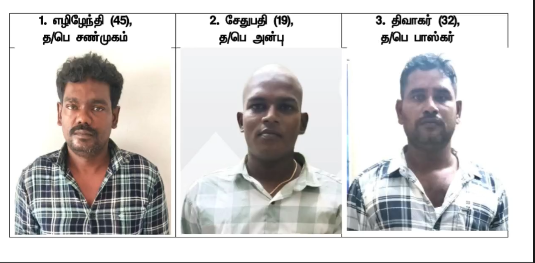 மயிலாடுதுறை மாவட்டம் சீர்காழியை அடுத்த கொள்ளிடம் ஊராட்சி மாங்கனாம்பட்டு கிராமத்தை சேர்ந்தவர் தஸ்லீம். இவர் வெளிநாட்டில் பணியாற்றி வருகிறார்.கடந்த மாதம் 1 ஆம் தேதி வீட்டில் அவரது மனைவி ஜாஸ்மின் அருகில் உள்ள அவரது தந்தை வீட்டிற்கு சென்றுள்ளனர். இவர்களது வீட்டின் மாடியில் வாடகைக்கு குடியிருப்பவரும் தனது சொந்த ஊருக்கு சென்றுள்ளார். காலை ஜாஸ்மின் வீட்டிற்கு வந்தபோது கதவுகள் அனைத்தும் பூட்டி இருக்க வீட்டின் அறையில் இருந்த நான்கு பீரோக்கள் உடைக்கப்பட்டு அதிலிருந்து 30 பவுன் தங்க நகைகள் மற்றும் ரூ 75 ஆயிரம் பணம் திருடப்பட்டது தெரியவந்தது. மேலும் மாடியில் உள்ள வீட்டில் கதவை உடைத்து உள்ளே புகுந்த மர்ம நபர்கள் அங்கு எதுவும் கிடைக்காத நிலையில் வீட்டின் உள்பக்கம் அமைந்துள்ள படிக்கட்டு வழி வழியாக ஜாஸ்மின் வீட்டிற்குள் புகுந்து நகை மற்றும் பணத்தை திருடி சென்றது தெரிய வந்தது. தொடர்ந்து இது குறித்த புகாரின் பேரில் ஆணைக்காரன் சத்திரம் போலீசார் வழக்கு பதிந்து விசாரணை மேற்கொண்டு வந்தனர். மேலும் தனிப்படைகள் அமைத்தும் குற்றவாளிகளை தேடி வந்த நிலையில் குற்றவாளிகளான விழுப்புரம் மாவட்டத்தைச் சேர்ந்த எழிழேந்தி, புதுப்பட்டினத்தைச் சேர்ந்த சேதுபதி, திவாகர் ஆகிய மூவரை தனிப்படை போலீசார் கைது செய்தனர். மேலும் அவர்களிடமிருந்து 15.5 சவரன் தங்க நகை ரூபாய் 7 லட்சம் ரொக்க பணத்தையும் பறிமுதல் செய்து குற்றவாளிகளிடம் தீவிர விசாரணை மேற்கொண்டு வருகின்றனர்