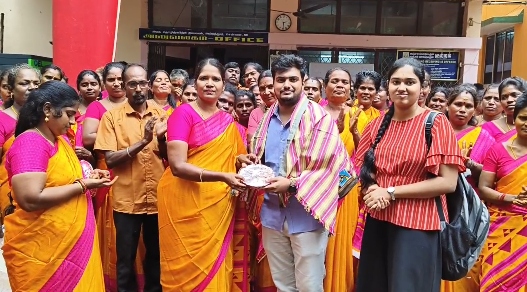 புத்தாடைகள், வழங்கியும் சால்வை அணிவித்து, தாம்பூலம் தட்டில் பழங்களை வைத்து மரியாதை செலுத்தப்பட்டன.