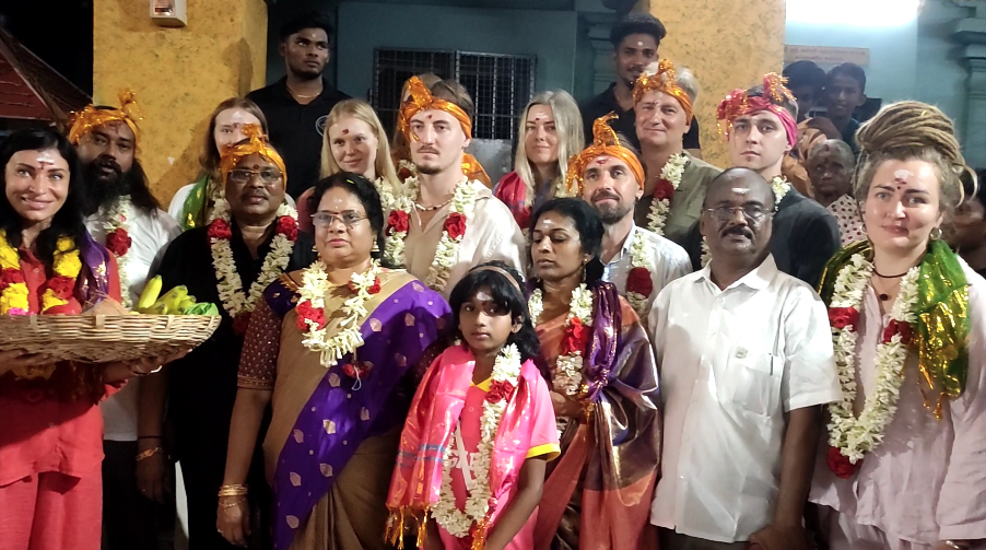 தொடர்ந்து அக்னீஸ்வரர் மற்றும் சுந்தர நாயகி சாமிகளுக்கு சிறப்பு தீபாரதனை காட்டப்பட்டது வெளிநாட்டினர் சாமி தரிசனம் செய்தனர் அவர்களுக்கு மலர் மாலை அணிவிக்கப்பட்டு பரிவட்டம் கட்டப்பட்டது. அப்போது கிராம மக்களுக்கு கோயில் வளாகத்தில் வெளிநாட்டினர் உணவு பரிமாறி மகிழ்ந்தனர்.