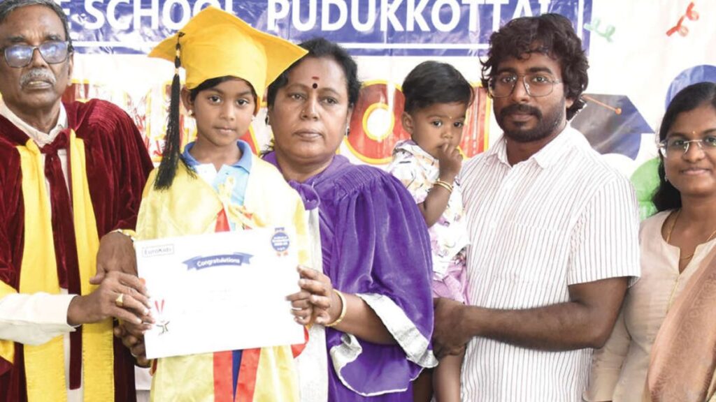 குழந்தைகளின் ஆரம்பக்கால கல்விப் பயணத்தின் ஒரு முக்கிய மைல்கல்லாகக் கருதப்படும் மழலையர் பள்ளி பட்டமளிப்பு விழா, புதுக்கோட்டை மறைமலை நகரில் உள்ள யூரோ கிட்ஸ் (Euro Kids) மழலையர் பள்ளியில் மிகச் சிறப்பாக நடைபெற்றது. பள்ளி வளாகத்தில் நடைபெற்ற இந்த விழாவிற்கு, பள்ளியின் தாளாளர் கவிஞர் ஆர்.எம்.வீ. கதிரேசன் தலைமை தாங்கினார். மழலையர்களின் எதிர்கால கல்வி வாழ்விற்கு அடித்தளம் அமைக்கும் விதமாக ஏற்பாடு செய்யப்பட்டிருந்த இந்த நிகழ்வு, பெற்றோர்கள் மற்றும் ஆசிரியர்களிடையே பெரும் நெகிழ்ச்சியை ஏற்படுத்தியது.