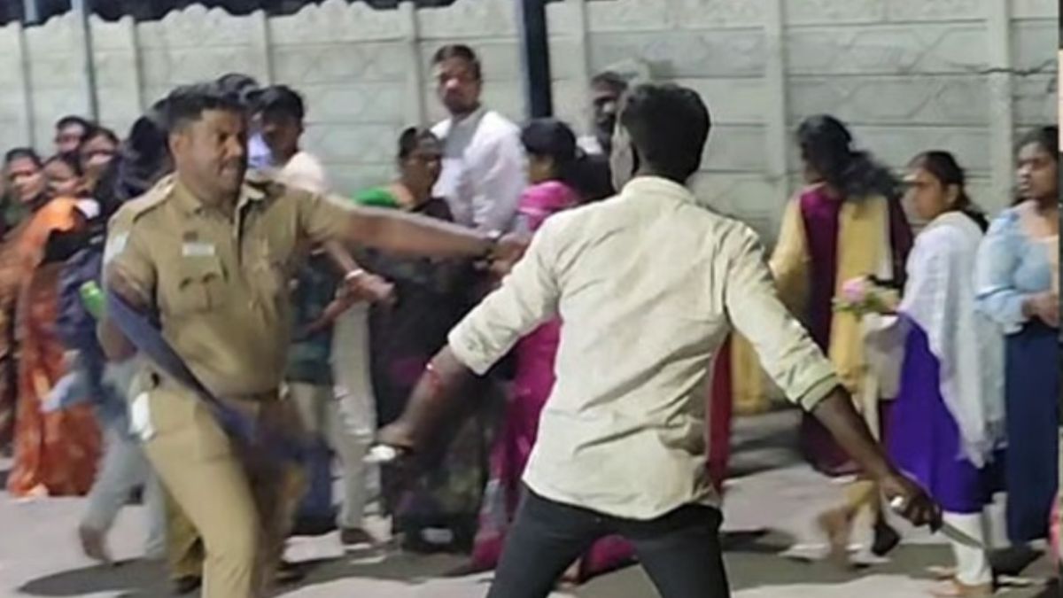பாதுகாப்புப் பணியில் இருந்த காவலர் ராமகிருஷ்ணன் அந்த நபரை எச்சரித்து அங்கிருந்து செல்லுமாறு கூறியுள்ளார். இதனால் ஆத்திரமடைந்த அந்த நபர், தான் மறைத்து வைத்திருந்த கூர்மையான பற்கள் உடைய பட்டாக்கத்தியை எடுத்து திடீரென காவலர் ராமகிருஷ்ணனை நோக்கி ஆக்ரோஷமாகப் பாய்ந்து வெட்ட முயன்றார். சற்றும் எதிர்பாராத இந்தத் தாக்குதலிலிருந்து தப்பிக்க, காவலர் ராமகிருஷ்ணன் மின்னல் வேகத்தில் தனது இடுப்பு பெல்ட்டை கழற்றி தற்காப்புக்காகப் பயன்படுத்தினார். இதனைப் பார்த்து அதிர்ச்சியடைந்த அங்கிருந்த மற்ற காவலர்கள், உடனடியாக அந்த ஆசாமியைச் சூழ்ந்து கொண்டு மடக்கிப் பிடித்தனர்.