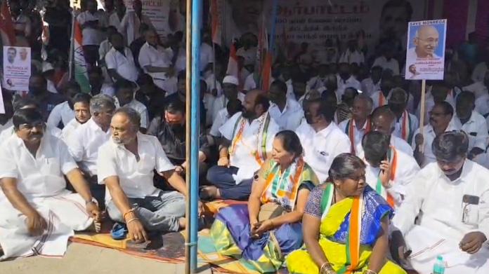மகாத்மா காந்தி தேசிய ஊரக வேலைவாய்ப்பு உறுதிச் சட்டத்தை சிதைக்கும் நோக்கில் செயல்படுவதாகக் கூறி, 100 நாள் வேலை திட்டத்தில் மகாத்மா காந்தி பெயரை மாற்றியதைக் கண்டித்தும், மீண்டும் மகாத்மா காந்தி பெயரை வைக்க வலியுறுத்தியும் திருப்பத்தூர் மாவட்ட ஆட்சியா் அலுவலகம் அருகே இந்த ஆா்ப்பாட்டம் நடைபெற்றது.