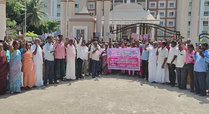 மயிலாடுதுறை மாவட்ட ஆட்சியர் அலுவலகம் முன்பு தமிழ்நாடு ஊரக வளர்ச்சித்துறை அனைத்து சங்கங்களின் கூட்டமைப்பு சார்பில் கண்டன ஆர்ப்பாட்டம் நடைபெற்றது. மாவட்டத் தலைவர் நாகராஜன் தலைமையில் நடைபெற்ற இந்த ஆர்ப்பாட்டத்தில் மாநில பொறுப்பாளர் சக்திவேல் உள்ளிட்ட நிர்வாகிகள் கலந்து கொண்டு கோரிக்கைகளை விளக்கி பேசினர். இதில் தூய்மை காவலர்களின் மாத ஊதியத்தை ரூ.10,000 ஆக உயர்த்தி வழங்க வேண்டும், மக்கள் நல பணியாளர்களுக்கு வழங்கப்பட்ட சிறப்பு காலமுறை ஊதியத்தை, காலமுறை ஊதியமாக நிர்ணயித்து பணி நிரந்தரம் செய்ய வேண்டும், ஊராட்சி செயலர்களை தமிழக அரசின் ஓய்வூதிய திட்டத்தில் இணைத்து, ஊராட்சி ஒன்றிய பதிவறை எழுத்தருக்கு பொருந்தும் அனைத்து சலுகைகளையும் வழங்க வேண்டும், கணினி உதவியாளர்களை பணி நிரந்தரம் செய்ய வேண்டும் உள்ளிட்ட 16 அம்ச கோரிக்கைகள் வலியுறுத்தப்பட்டன. இதில் தூய்மை காவலர்கள், மக்கள் நல பணியாளர்கள், மேல்நிலை நீர் தேக்க தொட்டி இயக்குபவர்கள், ஊராட்சி செயலர்கள், கணினி உதவியாளர்கள் உள்ளிட்ட ஊரக வளர்ச்சித் துறையின் அனைத்து சங்கங்களை சேர்ந்த நூற்றுக்கு மேற்பட்டோர் கலந்துகொண்டு கோரிக்கைகளை நிறைவேற்ற வலியுறுத்தி கண்டன முழக்கங்களை எழுப்பினர்.