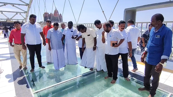 சர்வதேச சுற்றுலா மையமான கன்னியாகுமரி கடல் நடுவே அமைந்துள்ள விவேகானந்தர் பாறை மற்றும் திருவள்ளுவர் சிலையை இணைக்கும் கண்ணாடி பாலத்தில் கீறல் ஏற்பட்ட கண்ணாடியை புதிதாக மாற்றி அமைக்கப்பட்ட நிலையில் கன்னியாகுமரி சட்டமன்ற உறுப்பினர் தளவாய் சுந்தரம் ஆய்வு மேற்கொண்டார்