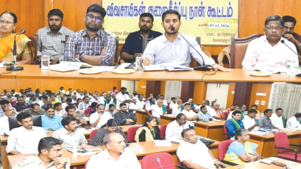 கோவை மாவட்ட ஆட்சித் தலைவர் அலுவலக கூட்டரங்கில், விவசாயிகளின் நீண்டகால கோரிக்கைகளுக்குத் தீர்வு காணும் வகையிலான மாதாந்திர விவசாயிகள் குறைதீர்ப்பு கூட்டம் மாவட்ட ஆட்சியர் பவன்குமார் கிரியப்பனவர் தலைமையில் வியாழக்கிழமை நடைபெற்றது. இக்கூட்டத்தில் மாவட்டத்தின் பல்வேறு பகுதிகளிலிருந்து வருகை தந்திருந்த விவசாயிகள், வேளாண்மை மற்றும் நீர்ப்பாசனம் சார்ந்த தங்களது வாழ்வாதாரப் பிரச்சினைகளை ஆட்சியரிடம் நேரடியாக முறையிட்டனர். குறிப்பாக, நொய்யல், கௌசிகா மற்றும் பவானி ஆகிய ஆறுகளில் கழிவுநீர் கலப்பதைத் தடுக்கப் போர்க்கால அடிப்படையில் நடவடிக்கை எடுக்க வேண்டும் என்றும், தென்னை நார் கழிவுகளால் நிலத்தடி நீர் மட்டம் பாதிக்கப்படுவதைக் கண்காணிக்க வேண்டும் என்றும் விவசாயிகள் வலியுறுத்தினர்.