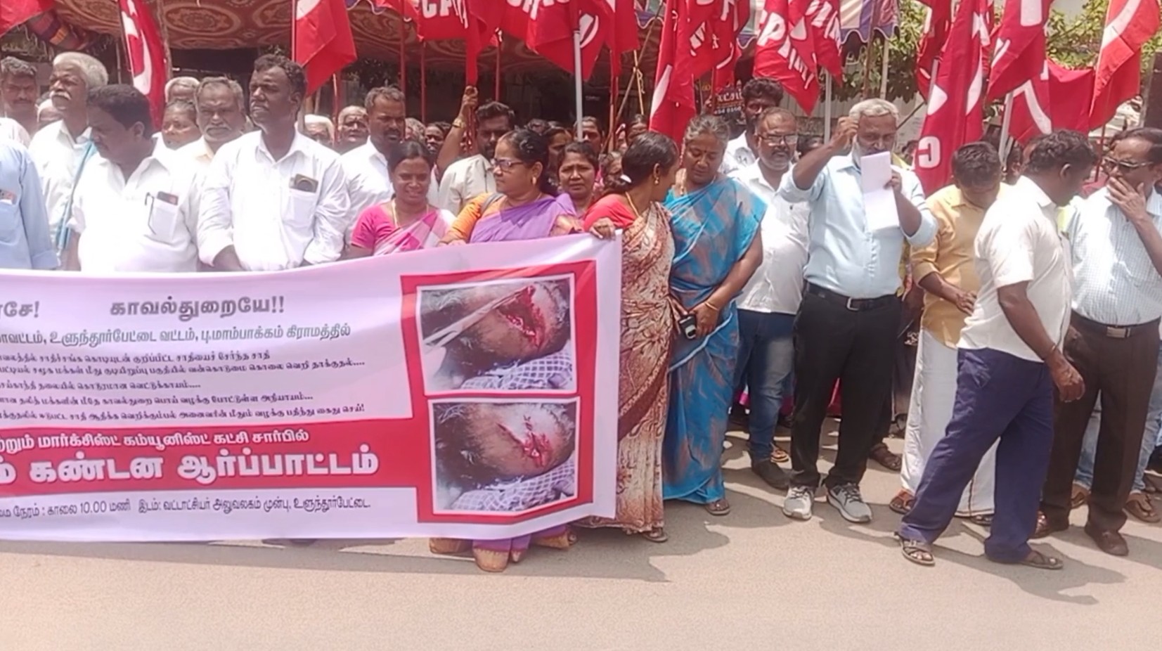 கள்ளக்குறிச்சி மாவட்டம் உளுந்தூர்பேட்டை அருகே உள்ள பூ.மாம்பாக்கம் கிராமத்தில் நடைபெற்ற விநாயகர் சதுர்த்தி ஊர்வலத்தில் சாதி சங்க கொடியுடன் குறிப்பிட்ட சமூகத்தைச் சேர்ந்த சாதி ஆதிக்க வெறியர்கள் பட்டியல் சமூக மக்கள் மீதும் குடியிருப்புகள் மீதும் தாக்குதல் நடத்தியதோடு பட்டியலின மக்களின் வீடுகளில் நிறுத்தி வைக்கப்பட்டிருந்த வாகனங்களை அடித்து நொறுக்கி சூறையாடிய சம்பவத்தில், பாதிக்கப்பட்ட பட்டியல் இன மக்கள் கொடுத்த புகாரின் மீது உளுந்தூர்பேட்டை போலீசார் உரிய நடவடிக்கை எடுக்காமல், பாதிக்கப்பட்ட மக்கள் மீது பொய் வழக்கு பதிவு செய்யப்பட்ட சம்பவத்தை கண்டித்து, உளுந்தூர்பேட்டை வட்டாட்சியர் அலுவலகம் முன்பு கிராம மக்களுடன் இணைந்து மார்க்சிஸ்ட் கம்யூனிஸ்ட் கட்சியினர் கண்டன ஆர்ப்பாட்டத்தில் ஈடுபட்டனர்.