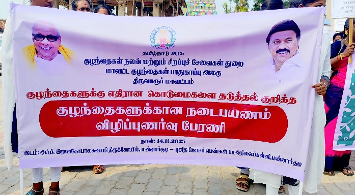 நவம்பர் 14 தேசிய குழந்தைகள் தினம், நவம்பர் 19 குழந்தைகளுக்கு எதிரான வன்கொடுமை தடுப்பு தினம், நவம்பர் 20 சர்வதேச குழந்தைகள் தினத்தை திருவாரூர் மாவட்டம் மன்னார்குடியில் குழந்தைகள் நலன் மற்றும் சிறப்பு சேவைகள் துறை, மாவட்ட குழந்தைகள் பாதுகாப்பு அலகு சார்பில் விழிப்புணர்வு பேரணி நடைபெற்றது இப்பேரணியினை மாவட்ட ஆட்சியர் வ. மோகனசந்திரன் துவக்கி வைத்தார் இப்பேரணி தேரடியில் தொடங்கி மன்னார்குடி முக்கிய வீதிகளின் வழியாக சென்று தூயவளனார் பெண்கள் மேல்நிலைப் பள்ளியில் நிறைவுற்றது. குழந்தை திருமணம் நடைபெறுதல் தடுத்தல், குழந்தைகளுக்கு எதிரான பாலியல் வன்கொடுமை தடுத்தல், 14 வயதிற்கு உட்பட்ட உறுதிப்படுத்துதல், அனைத்து குழந்தைகளும் பள்ளிக்கு செல்வதை குழந்தை தொழிலாளர் உருவாக்குதல், மது போதைக்கு அடிமையாதல் தடுத்தல் உள்ளிட்ட வாசகங்கள் அடங்கிய பதாகைகளை ஏந்தியவாறு பொதுமக்களுக்கு துண்டு பிரசுரங்களை வழங்கி முழக்கங்கள் எழுப்பினர்