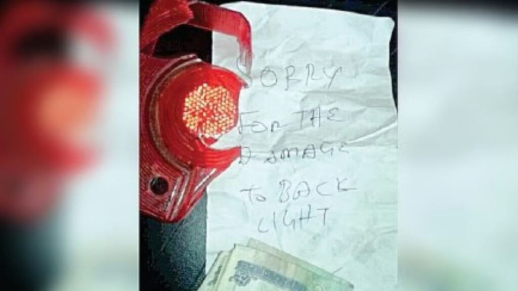 யார் இதனைச் செய்திருப்பார்கள் என அவர் ஆவேசத்துடன் தேடியபோது, அவரது ஹெல்மெட்டிற்குள் ஒரு சிறிய காகிதம் சுருட்டி வைக்கப்பட்டிருப்பதைக் கவனித்தார். அதனை எடுத்துப் பார்த்தபோது, அதில் ஆங்கிலத்தில் ‘பைக் லைட்டை உடைத்ததற்கு மன்னிக்கவும்’ (Sorry for breaking the bike light) என மிக உருக்கமாக எழுதப்பட்டிருந்தது. மேலும், அந்தத் தவற்றுக்கான பரிகாரமாக உடைந்த லைட்டைச் சரி செய்து கொள்ள அந்த நபர் இரண்டு நூறு ரூபாய் நோட்டுகளை (₹200) அத்தோடு இணைத்து வைத்திருந்தார்.