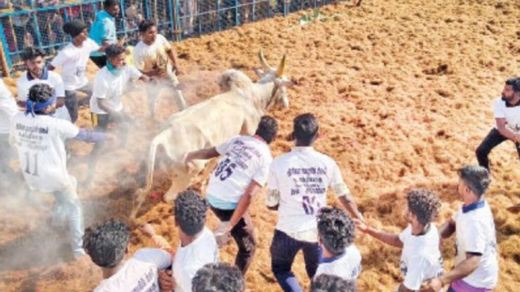 தமிழகத்தின் வீர விளையாட்டான ஜல்லிக்கட்டு போட்டிகள் புதுக்கோட்டை மற்றும் திருச்சி மாவட்டங்களில் இன்று மிக பிரம்மாண்டமாக நடைபெற்றன. இரண்டு இடங்களிலும் சேர்த்து மொத்தம் 1,250 காளைகள் வாடிவாசலில் இருந்து அவிழ்த்து விடப்பட்ட நிலையில், அவற்றை அடக்க 600 மாடுபிடி வீரர்கள் களத்தில் மல்லுக்கட்டினர். புதுக்கோட்டை மாவட்டம் ஆலங்குடி அருகே உள்ள காட்டுப்பட்டியில் அருள்மிகு மாரியம்மன் கோயில் திருவிழாவை முன்னிட்டு ஜல்லிக்கட்டு போட்டி எழுச்சியுடன் நடைபெற்றது. இந்த போட்டியில் புதுக்கோட்டை, திருச்சி, சிவகங்கை, தஞ்சை உள்ளிட்ட பல்வேறு மாவட்டங்களிலிருந்து 650க்கும் மேற்பட்ட காளைகள் கொண்டு வரப்பட்டன. போட்டியில் பங்கேற்ற 300 வீரர்களும் முறைப்படி உறுதிமொழி எடுத்துக் கொண்டதை அடுத்து, காலை 9 மணிக்கு ஆர்டிஓ ஐஸ்வர்யா போட்டியைத் தொடங்கி வைத்தார். முதலில் கோயில் காளைகள் அவிழ்த்து விடப்பட்டன, அதனைத் தொடர்ந்து சீறிப்பாய்ந்து வந்த மற்ற காளைகளை வீரர்கள் துணிச்சலுடன் அடக்கினர். சில காளைகள் பிடிபடாமல் களத்தில் நின்று விளையாட்டு காட்டியது பார்வையாளர்களை மெய்சிலிர்க்க வைத்தது. வெற்றி பெற்ற வீரர்களுக்கும், காளைகளின் உரிமையாளர்களுக்கும் வெள்ளி நாணயம், மின் விசிறி, மிக்சி, கட்டில், டைனிங் டேபிள், சைக்கிள் மற்றும் ரொக்க பரிசுகள் வழங்கப்பட்டன. பாதுகாப்பு பணிகளை ஆலங்குடி டிஎஸ்பி மனோகர் தலைமையிலான போலீசார் கவனித்துக் கொண்டனர்.