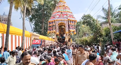 அந்த வகையில் இன்று தேரோட்ட திருவிழாவை முன்னிட்டு 60 அடி உயரமுள்ள திருத்தேரில் சுப்பிரமணிய சுவாமி வள்ளி தேவசேனா ஸ்வாமி எழுந்தருள் எழுந்தருள் செய்யப்பட்டது வேத மந்திரங்கள் முழங்க தீபாராதனை காண்பிக்கப்பட்டு நூற்றுக்கணக்கான பக்தர்கள் தேரை வடம் பிடித்து இழுத்தனர். இந்த தேர் ஆனது கீழ வீதியில் இருந்து புறப்பட்டு தெற்கு வீதி மேலவீதி வடக்கு வீதி வழியாக நில ஆடையை வந்து சேரும் மேலும் இந்த தேரோட்ட திருவிழாவை காண்பதற்காக ஸ்ரீவாஞ்சியம் கிராம மக்கள் மட்டுமல்லாது பல்வேறு ஊர்களில் இருந்து ஏராளமான பக்தர்கள் வருகை புரிந்து தேரை வடம் பிடித்து இழுத்தனர் மேலும் பாதுகாப்பு பணியில் நன்னிலம் துணை காவல் கண்கணிப்பாளர் தமிழமாறன் தலைமையில் 100க்கும் மேற்பட்ட போலீசார் மற்றும் தீயணைப்பு துறையினர் ஈடுபட்டுள்ளனர்.