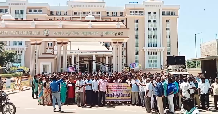 மயிலாடுதுறை மாவட்டத்தில் தொடக்க வேளாண்மை கூட்டுறவு கடன் சங்கங்கள் நகர கூட்டுறவு கடன் சங்கங்களில் பணிபுரியும் பணியாளர்கள் நியாய விலை கடை பணியாளர்கள் நகை மதிப்பீட்டாளர்கள் கணினி பணியாளர்கள் ஆகியோர் 25 அம்ச கோரிக்கையை நிறைவேற்ற வலியுறுத்தி மயிலாடுதுறை மாவட்ட ஆட்சியர் அலுவலகம் முன்பு கண்டன ஆர்ப்பாட்டம் நடத்தினர். மாவட்ட தலைவர் பரதன் தலைமையில் நடைபெற்ற ஆர்ப்பாட்டத்தில் ஊதிய உயர்வு வெளிப்படை தன்மையுடன் சங்கங்களை வகைப்பாடு செய்யாமல் லாப நஷ்டங்களை கணக்கில் கொள்ளாமல் 2018 ஆம் ஆண்டு மார்ச் 31 ஆம் தேதிய ஊதிய ஒப்பந்தத்தை அடிப்படையாகக் கொண்டு பணியாளர்கள் பெற்று வந்த சம்பளத்தின் மீது 20 சதவீத ஊதிய உயர்வு வழங்க வேண்டும், 2021 ஆம் ஆண்டுக்கு பிறகு ஓய்வு பெற்ற பணியாளர்கள் அனைவருக்கும் உடனடியாக ஓய்வூதியம் வழங்க வேண்டும், தேவையற்ற இடங்களில் முதல்வர் மருந்தகம் ஏற்படுத்தி தினசரி ரூ.1,000-க்கு விற்பனை செய்தே ஆக வேண்டும் என கட்டாயப்படுத்துவதை கைவிட வேண்டும், அனைத்து பணியாளர்களும் சொந்த ஊருக்கு அருகாமையில் பணிபுரியும் வகையில் இடமாறுதலுக்கு வழிவகை செய்ய வேண்டும் உள்ளிட்ட 25 அம்ச கோரிக்கைகள் வலியுறுத்தப்பட்டன. இதில் சங்க ஊழியர்கள் 300-க்கு மேற்பட்டோர் கலந்து கொண்டனர்.