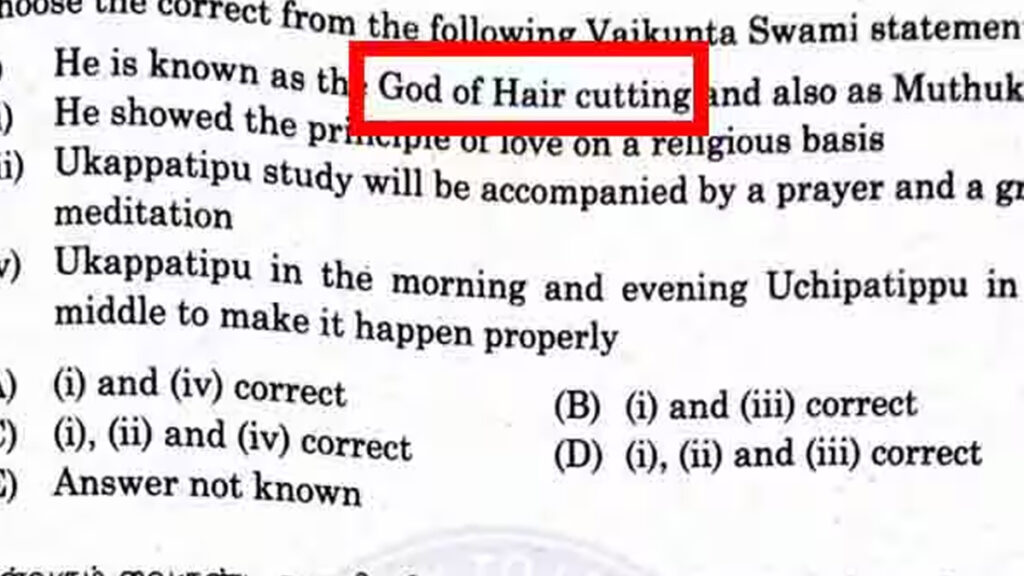 இந்தத் தேர்வில், அய்யா வைகுண்டரின் பெயரான “முடிசூடும் பெருமாள்” என்பதை “the god of hair cutting” என தவறாக மொழிபெயர்த்திருப்பது, மத உணர்வுகளை புண்படுத்தும் வகையில் உள்ளதென அவர் குறிப்பிட்டார்.