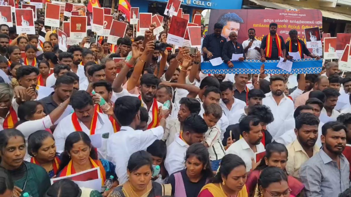 வெளிமாநிலம்/வெளியூர் சென்று வாழும் வாக்காளர்கள் தங்களது வாக்குகளைப் பதிவு செய்யப் பயன்படுத்த உத்தேசிக்கப்பட்டுள்ள ‘ரிமோட் எலக்ட்ரானிக் வோட்டிங் மெஷின்’ (Remote Electronic Voting Machine – SIR) முறையை எதிர்த்துக் கண்டனம் தெரிவித்து, திண்டுக்கல்லில் தமிழக வெற்றிக் கழகத்தின் சார்பில் இன்று மாபெரும் கண்டன ஆர்ப்பாட்டம் நடைபெற்றது. திண்டுக்கல் மாவட்டச் செயலாளர் திரு. தேவா அவர்களின் தலைமையில் நடைபெற்ற இந்த ஆர்ப்பாட்டத்தில், சுமார் 500க்கும் மேற்பட்ட தமிழக வெற்றிக் கழகத் தொண்டர்கள் மற்றும் நிர்வாகிகள் கலந்துகொண்டனர்.