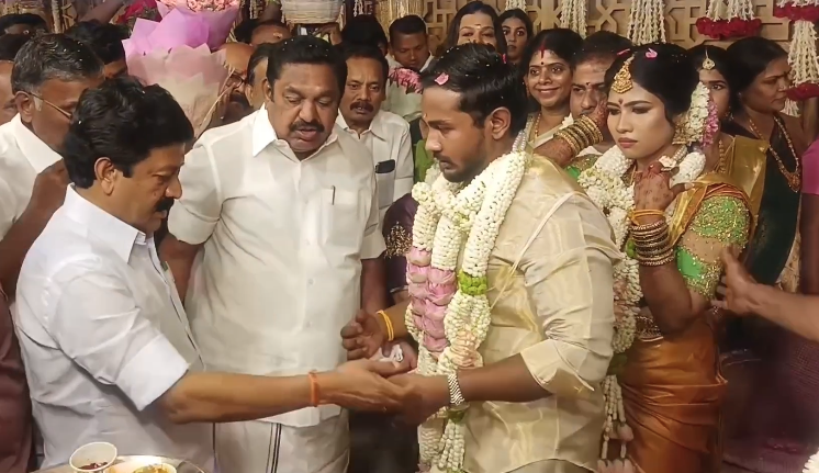 செங்கல்பட்டு மாவட்டம் மாமல்லபுரம் பூஞ்சேரி, தனியார் திருமணம் மஹாலில் அதிமுக முன்னாள் அமைச்சர் சி.வி சண்முகம்* அவர்களின் மூத்த சகோதரர் நியூஸ் ஜெ தொலைக்காட்சி நிர்வாக இயக்குனரான ராதாகிருஷ்ணன் மகன் அர்ஜுன் திருமண இல்லத் திருமண விழாவிற்கு முன்னால் முதலமைச்சர் எதிர்க்கட்சித் தலைவர் எடப்பாடி பழனிச்சாமி சிவி சண்முகம் இல்ல திருமண விழாவிற்கு வருகை தந்து மணமக்களை வாழ்த்தினார் அவருடன் அதிமுக மூத்த நிர்வாகிகள் முன்னாள் அமைச்சர்கள் பங்கேற்று மணமக்களை வாழ்த்தினார்கள்.முன்னாள் அமைச்சர் சிவி சண்முகம் இல்ல திருமண விழா