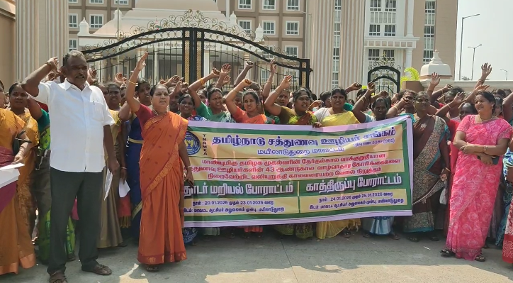 கடந்த 2021 ஆம் ஆண்டு நடைபெற்ற சட்டமன்ற தேர்தலின் போது திமுக சார்பில் 500க்கும் மேற்பட்ட வாக்குறுதிகள் அளிக்கப்பட்டது. இதில் 313 வது வாக்குறுதியாக சத்துணவு ஊழியர்களுக்கு சிறப்பு கால முறை ஊதியம் வழங்கப்படும், பென்ஷன் தொகை அதிகரித்து தரப்படும் என்பன உள்ளிட்ட பல்வேறு கோரிக்கைகள் வாக்குறுதிகளாக தரப்பட்டது. தமிழக அரசு பொறுப்பேற்று நான்கரை ஆண்டுகள் கடந்த நிலையில், தேர்தல் வாக்குறுதியை நிறைவேற்றவில்லை. இதனைத் தொடர்ந்து சத்துணவு ஊழியர்கள் இன்று முதல் வேலை நிறுத்த போராட்டத்தில் ஈடுபட்டுள்ளனர். இதன் காரணமாக அரசு பள்ளிகளில் சத்துணவு வழங்கும் பணி பாதிக்கப்பட்டுள்ளது. தமிழ்நாடு அரசு சத்துணவு ஊழியர்கள் சங்கம் சார்பில் மயிலாடுதுறை மாவட்ட ஆட்சியர் அலுவலகத்தின் எதிரே கோரிக்கைகளை வலியுறுத்தி கண்டன ஆர்ப்பாட்டம் நடைபெற்றது. தொடர்ந்து சாலை மறியல் போராட்டத்தில் ஈடுபட்ட நூற்றுக்கணக்கான சத்துணவுப் பெண் ஊழியர்களை காவல்துறையினர் கைது செய்து மண்டபத்தில் அடைத்து வைத்தனர். போராட்டத்தில் பங்கேற்ற சத்துணவு ஊழியர்கள் கோரிக்கைகளை வலியுறுத்தியும் தமிழக அரசை கண்டித்தும் கண்டன கோஷங்களை எழுப்பினர். தங்கள் கோரிக்கைகள் நிறைவேறும் வரை போராட்டம் தொடரும் என அப்போது அவர்கள் தெரிவித்தனர்.