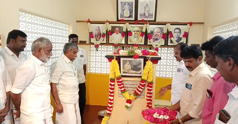 திருவாரூர் அருகே காட்டூர் கிராமத்தில் உள்ள மறைந்த திமுக தலைவர் கலைஞரின் தாயார் அஞ்சுகம் அம்மையாரின் நினைவிடத்தில் மறைந்த மத்திய அமைச்சர் முரசொலி மாறன் 22 ஆம் ஆண்டு நினைவு நாள் நிகழ்ச்சியில் திருவாரூர் திமுக மாவட்ட செயலாளரும் சட்டமன்ற உறுப்பினர் பூண்டி .கலைவாணன் தலைமையில் அவரது திருவுருவப் படத்திற்கு மலர் மாலை அணிவித்து மலர் தூவி மரியாதை செலுத்தப்பட்டது.
