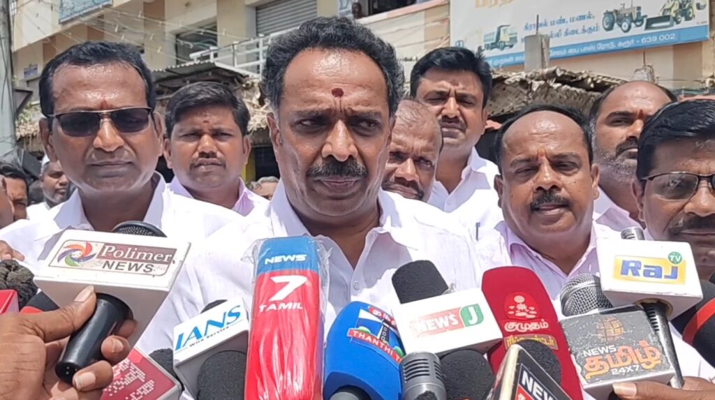 கரூரில் எதிர்கட்சித் தலைவர் எடப்பாடி பழனிச்சாமி வருகையை முன்னிட்டு சுவர் விளம்பரம் எழுதுவது தொடர்பாக பிரச்சினை – சம்பவ இடத்திற்கு வந்த முன்னாள் அமைச்சர் எம்.ஆர்.விஜயபாஸ்கர் போலீசாரிடம் வாக்குவாதம்.