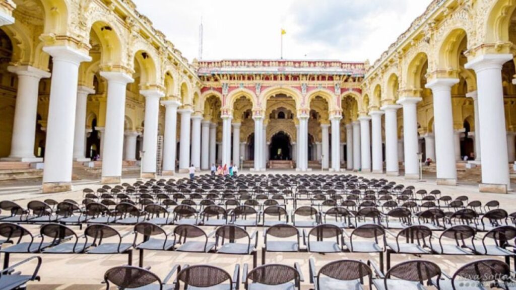 கி.பி. 1636-இல் மதுரையை ஆண்ட திருமலை நாயக்கர் மன்னர் கட்டிய இந்த பிரமாண்ட மாளிகை, இத்தாலிய கட்டிடக் கலைக்கு தமிழ் அரச கலை சேர்க்கப்பட்ட வகையில் திகழ்கிறது. 58 அடி உயரம் கொண்ட 248 தூண்கள் மற்றும் விரிவான மேல் மாடம் ஆகியவை நாயக்கர் ஆட்சியின் பொற்கால கலைநயத்தை வெளிப்படுத்துகின்றன.
