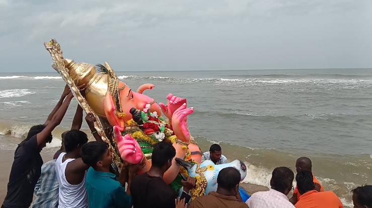 அப்பொழுது விதவிதமான வர்ணம் நிறத்தில் விநாயகர் சிலைகளை கடலில் கரைக்கப்பட்டனர்.
