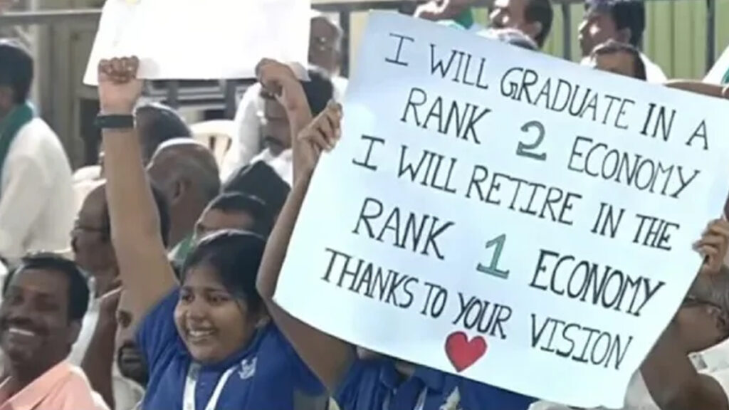 “நான் படிப்பு முடித்து பட்டம் பெறும் நேரத்தில் இந்தியா உலகின் இரண்டாம் பெரிய பொருளாதாரமாக இருக்கும். நான் ஓய்வு பெறும் நேரத்தில் அது முதலிடத்தை அடையும். உங்கள் தொலைநோக்கு பார்வைக்கு நன்றி.” என்று வாசகம் இருந்தது.