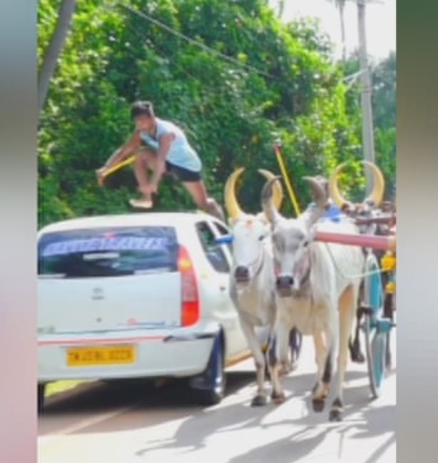 சிவகங்கை மாவட்டம் சிங்கம்புணரியில், முத்துராமலிங்க தேவரின் குருபூஜையை முன்னிட்டு, நேற்று மாட்டுவண்டி பந்தயம் நடைபெற்றது. பந்தய தூரத்தை கடக்க, மாட்டுவண்டிகள் சாலையில், மின்னல் வேகத்தில் சென்றன.சத்யா என்ற இளைஞர் மாட்டு வண்டியின், துணை சாரதியாக, சாலையில் ஓடி வந்தார். காளாப்பூர் என்ற இடத்தில், மாட்டு வண்டிக்கு எதிரே கார் வந்துவிட்டது. இதனை சற்றும் எதிர்பாராத அந்த இளைஞர் உடனே சினிமா ஸ்டண்ட் கலைஞரை போல் ஒரு நொடியில் காரின் மீது ஒரு கால் வைத்து தாவிக்குதித்தார். இதுதொடர்பான காட்சி, சமூக வலைத்தளங்களில் வைரலாகி வருகிறது. இந்த சம்பவத்தில் சத்யாவுக்கு எந்த பாதிப்பும் இல்லை. ஆனால், காரின் மேற்கூரை, லேசாக சொட்டையாகிப்போனது.