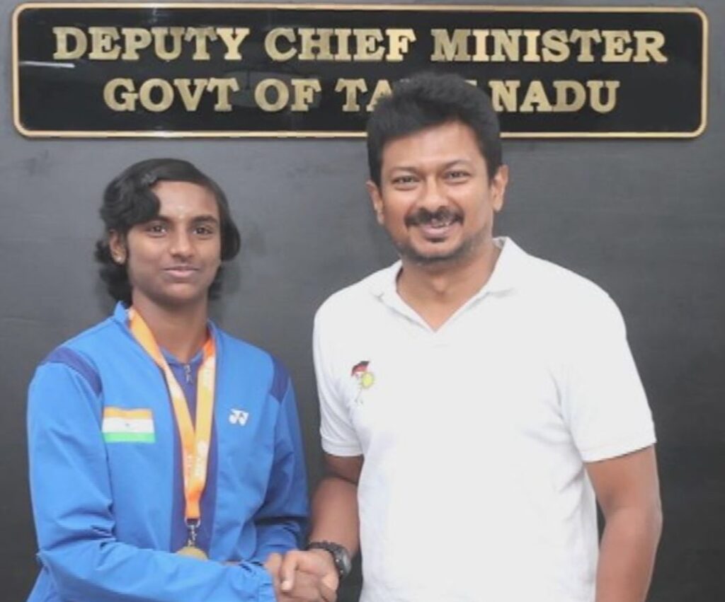 சீனாவில் நடைபெற்ற ஆசிய பேட்மிண்டன் போட்டியில் தங்கம் சென்ற திருவள்ளூர் மாவட்டத்தைச் சேர்ந்த வீராங்கனை தீக்சாவை துணை முதலமைச்சர் உதயநிதி ஸ்டாலின் நேரில் அழைத்து பாராட்டு தெரிவித்தார்.