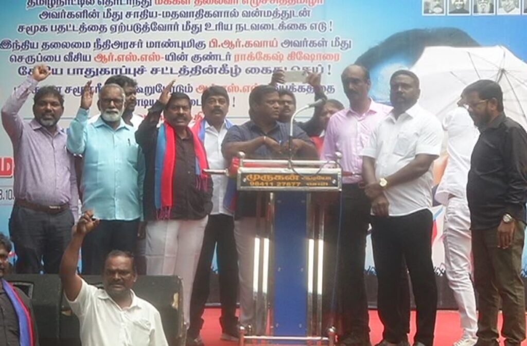 திருமாவளவனை குறிவைக்கும் சாதி-மதவாதிகளுக்கு எதிராக நடவடிக்கை கோரி சென்னையில் விடுதலை சிறுத்தைகள் கட்சி சார்பில் இன்று ஆர்ப்பாட்டம் நடைபெற்றது. –