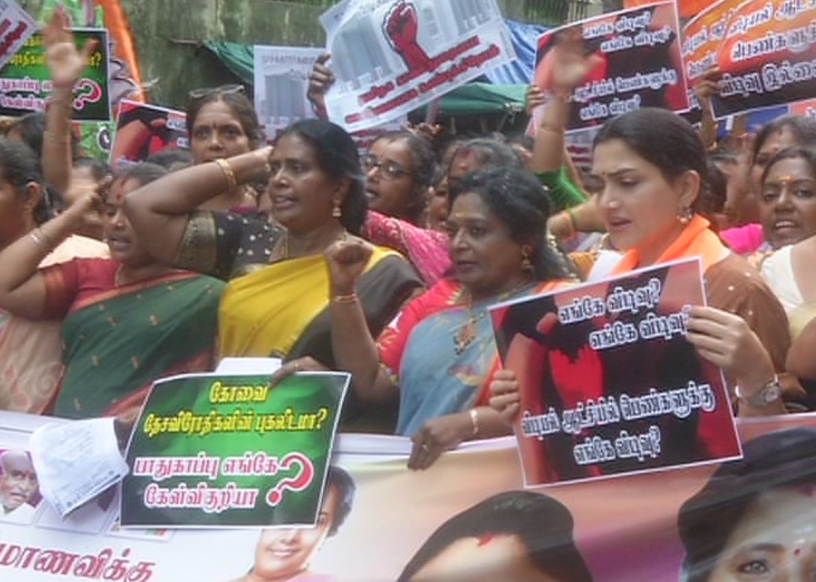 கோவையில் கல்லூரி மாணவி கூட்டு பாலியல் வன்கொடுமை செய்யப்பட்ட சம்பவத்தைக் கண்டித்து சென்னையில் பிஜேபி மகளிரணி சார்பில் ஆர்ப்பாட்டம் நடைபெற்றது. மாவட்ட ஆட்சியர் அலுவலகம் அருகே நடைபெற்ற இந்த ஆர்ப்பாட்டத்தில், தமிழிசை சவுந்தரராஜன், நடிகை குஷ்பு உள்ளிட்டோர் கலந்து கொண்டு தமிழக அரசுக்கு எதிராக முழக்கங்களை எழுப்பினர்.