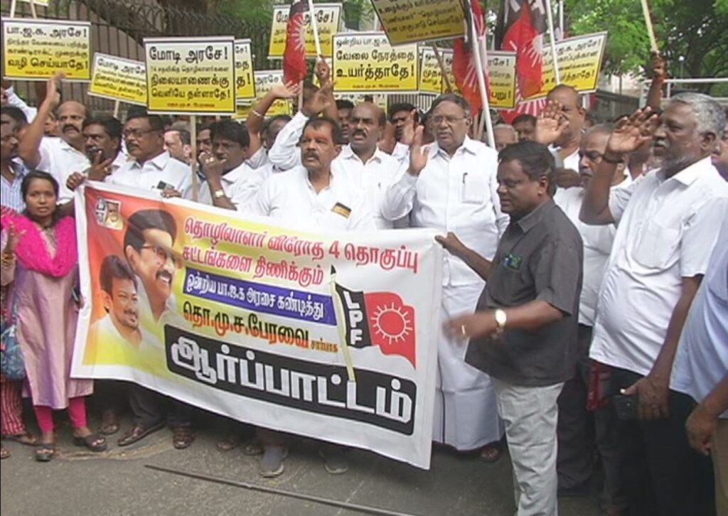 சென்னையில், மத்திய அரசின் சட்டங்களைக் கண்டித்து, தொமுக தலைவர் நடராஜன் தலைமையில் ஆர்ப்பாட்டம் நடைபெற்றது. இதில் மத்திய அரசுக்கு எதிராகவும், தொழிலாளர்களின் உரிமைகளை பாதுகாக்க வலியுறுத்தியும் கோஷங்கள் எழுப்பப்பட்டன.