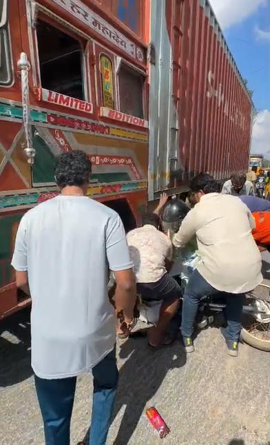 திருவள்ளூர் அடுத்த மணவாளநகரை சேர்ந்தவர் நாகேஸ்வரராவ் இவரது மனைவி சங்கீதா இந்த தம்பதியினர் தனது இருசக்கர வாகனத்தில் திருத்தணிக்கு சென்றுவிட்டு மீண்டும் வீட்டிற்கு வந்து கொண்டு இருந்தனர். அப்பொழுது திருவள்ளூர் ஆயில்மில் பகுதியில் வந்தபோது சாலை உள்ள வேகத்தடையில் இருசக்கர வாகனத்தை ஏற்றி இறக்கிய போது எதிர் பாராத விதமாக இருசக்கர வாகனம் நிலைதடுமாறி வலது புறமாக சென்று கொண்டிருந்த கண்டெய்னர் லாரிக்கு அடியில் கணவன், மனைவி இருவரும் விழுந்துள்ளார். இதனை கண்ட அப்பகுதியில் மாற்றுத்திறனாளிகளுக்கு உணவு வழங்கி கொண்டிருந்த திலீபன் என்ற இளைஞர் சத்தம் போட்டு கூச்சலிட்டு லாரியை நிறுத்தச் சொன்னதால் சுதாரித்துக்கொண்ட லாரி ஓட்டுநர் உடனடியாக லாரியை நிறுத்தியதால் லாரியின் பின் சக்கரத்தில் சிக்காமல் கணவன், மனைவி அதிஷ்டவசமாக உயிர்தப்பினர். இந்த சம்பவத்தால் அந்த பகுதியில் பெரும் பரபரப்பை ஏற்படுத்தியது. இதனை அடுத்து லாரியின் அடியில் சிக்கிய இருவரையும் திலீபன் மற்றும் அங்கு இருந்தவர்கள் அவர்களை மீட்டு தண்ணீர் கொடுத்து ஆசுவாசப்படுத்தி அவர்களை மருத்துவ மனைக்கு அனுப்பி வைத்தனர். கண்டெய்னர் லாரிக்கு அடியில் விழுந்த கணவன், மனைவியை கூச்சலிட்டு லாரியை நிறுத்தி காப்பாற்றிய திலீபன் என்ற இளைஞரை பொதுமக்கள் வெகுவாக பாராட்டி வருகின்றனர்