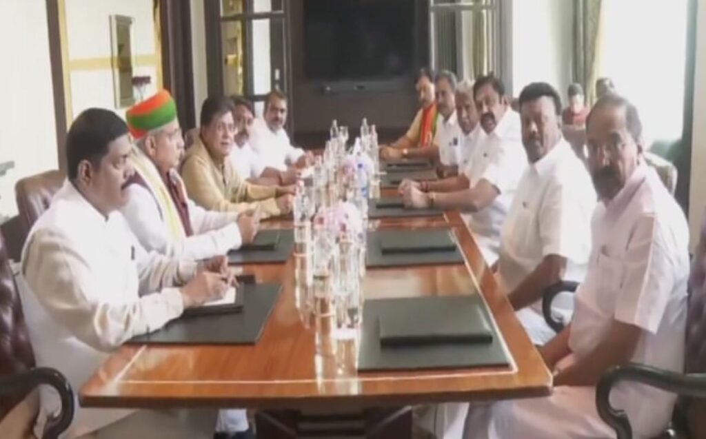 இதையடுத்து, எம்.ஆர்.சி நகரில் உள்ள நட்சத்திர விடுதியில் அதிமுக பொதுச்செயலாளர் எடப்பாடி பழனிசாமியை, பியூஸ்கோயல், அர்ஜூன்ராம் மெக்வால், முரளிதர் சோஹல் ஆகியோர் சந்தித்து பேசினர். அப்போது, அதிமுக மூத்த தலைவர்கள் எஸ்.பி.வேலுமணி, கே.பி.முனுசாமி, தங்கமணி, திண்டுக்கல் சீனிவாசன் உள்ளிட்டோர் உடனிருந்தனர்.