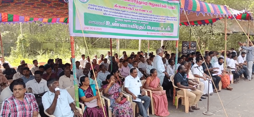 திருவாரூர் மாவட்ட ஆட்சியர் அலுவலகம் முன்பு தமிழ்நாடு ஊரக வளர்ச்சித் துறை அலுவலர்கள் சங்க மாவட்டத் தலைவர் வசந்தன் தலைமையில் உண்ணாவிரதம் போராட்டம் நடைபெற்றது. இந்தப் போராட்டத்தின் பிரதான கோரிக்கையாக மகாத்மா காந்தி தேசிய ஊரக வேலை உறுதி சட்டம் 2005 பெயரினை விக்சித் பாரத் ரோஸ்கர் மற்றும் ஆஜீவிகா மிஷன் கிராமின் 2005 என பெயர் மாற்றி திட்டத்திற்கான நிதியினை வெகுவாக குறைத்து ஏழை எளிய மக்களை வஞ்சிக்க நினைக்கும் மத்திய அரசை கண்டித்தும், இந்த மக்கள் விரோத ஊழியர் விரோத மசோதாவை மத்திய அரசு திரும்பப் பெற வலியுறுத்தி மாநிலம் தழுவிய உண்ணாவிரத போராட்டம் நடைபெற்று வருகிறது. திருவாரூர் மாவட்ட ஆட்சியர் அலுவலகம் முன்பு நடைபெற்ற இந்த உண்ணாவிரத போராட்டத்தை மாநில துணைத் தலைவர் சௌந்திரபாண்டியன் துவங்கி வைத்தார். 200க்கும் மேற்பட்ட ஊரக வளர்ச்சித் துறை அலுவலர்கள் கலந்து கொண்டனர்.