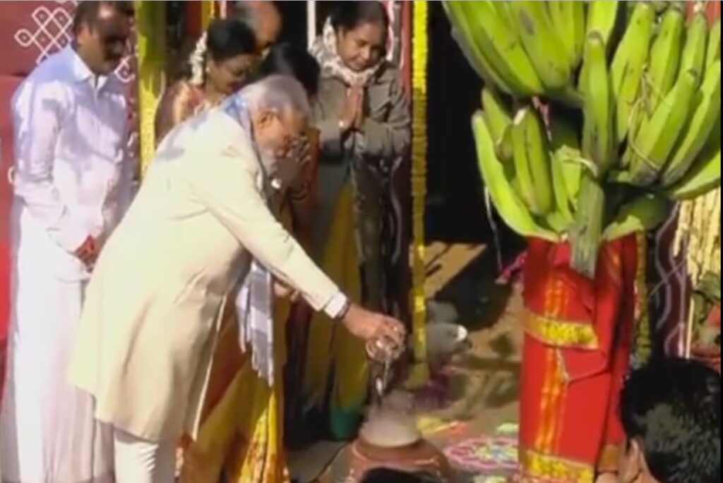 இந்த ஆண்டு எல்.முருகன் இல்லத்தில் இன்று நடைபெற்ற விழாவில் பங்கேற்ற பிரதமர் மோடி, பொங்கல் பானைக்கு தீபாராதனை காண்பித்து வழிபட்டார். தொடர்ந்து, பசு மாட்டிற்கு பச்சரிசி, வெல்லத்தை பிரதமர் வழங்கினார்.