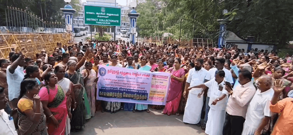 திருவாரூரில் தமிழ்நாடு சாதனை ஊழியர்கள் சங்கம் சார்பில் காலமுறை ஊதியம் வழங்கிட வேண்டும் உள்ளிட்ட பல்வேறு கோரிக்கைகளை வலியுறுத்தி 500க்கும் மேற்பட்டோர் சாலை மறியல் போராட்டத்தில் ஈடுபட்டனர்.தமிழ்நாடு சத்துணவு ஊழியர் சங்கம் சார்பில் திருவாரூர் மாவட்ட ஆட்சியர் அலுவலகம் முன்பு தமிழ்நாடு சத்துணவு ஊழியர் சங்க மாவட்ட தலைவர் மகாலட்சுமி தலைமையில் சாலை மறியல் போராட்டம் நடைபெற்றது.போராட்டத்தின் பிரதான கோரிக்கையாக 2021 சட்டமன்றத் தேர்தல் கால வாக்குறுதி எண் 313 நிறைவேற்றிட வேண்டும், காலமுறை ஊதியம் வழங்கிட வேண்டும், குடும்ப பாதுகாப்புடன் கூடிய ஓய்வூதியம் பணிக்கொடை உள்ளிட்ட கோரிக்கைகளை வலியுறுத்தி சாலை மறியல் போராட்டத்தில் ஈடுபட்டனர்.மறியல் காரணமாக திருவாரூர் – தஞ்சாவூர் தேசிய நெடுஞ்சாலையில் சுமார் ஒரு மணி நேரம் போக்குவரத்து பாதிப்பு ஏற்பட்டது