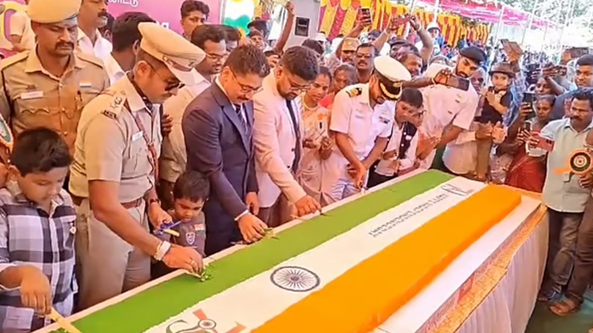 ஆனால், விழா முடிந்ததும் நடந்த ஒரு நிகழ்ச்சி சர்ச்சையை கிளப்பியுள்ளது. மாவட்ட ஆட்சியர் சிம்ரன்ஜீத் சிங் காலோன் மற்றும் காவல் கண்காணிப்பாளர் சந்தீஷ், 16 அடி நீளம், 3.25 அடி அகலம், 79 கிலோ எடையுடைய தேசியக் கொடி வடிவிலான கேக்கை இணைந்து வெட்டி, பொதுமக்களுக்கும் அதிகாரிகளுக்கும் வழங்கினர்.