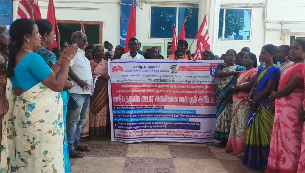மயிலாடுதுறை மாவட்டம் மயிலாடுதுறை ஊராட்சி ஒன்றிய அலுவலகம் முன்பு ஏஐடியுசி தொழிற்சங்கத்துடன் இணைந்த தமிழ்நாடு ஊரக வளர்ச்சித்துறை தொழிலாளர் சங்கத்தின் சார்பில் உணவு இடைவெளி நேரத்தில் ஆர்ப்பாட்டம் நடைபெற்றது. இதில் மயிலாடுதுறை குத்தாலம் மற்றும் செம்பனார்கோவில் ஒன்றியங்களுக்கு உள்பட்ட பகுதிகளில் பணியாற்றும் தூய்மை பணியாளர்கள் நூற்றுக்கு மேற்பட்டோர் கலந்து கொண்டனர். இந்த ஆர்ப்பாட்டத்தில், ஏ ஐ டி யு சி மாவட்ட தலைவர் ராஜ்மோகன் கலந்து கொண்டு, ஊரக வளர்ச்சி மற்றும் ஊராட்சி துறையில் போராட்டத்தை தூண்டிவிடும் கூடுதல் இயக்குனர் ஆனந்தராஜ் மீது நடவடிக்கை எடுத்திட வேண்டும், ஞாயிற்றுக்கிழமைகளில் விடுமுறை வழங்க வேண்டும், தினம்தோறும் காலை 7:00 மணிக்கு கள ஆய்வு செய்வதை நிறுத்திட வேண்டும், குப்பைகளை சேகரிக்க தள்ளுவண்டி, மூன்று சக்கர வண்டிகளுக்கு பதிலாக மின்கலன் வண்டிகளை வழங்கி பராமரிக்க வேண்டும், ஜனவரி மாதம் முதல் சுகாதார ஊக்குனர்களுக்கு வழங்காமல் நிலுவையில் உள்ள தொகுப்பூதியத்தை உடனடியாக வழங்கிட வேண்டும் என வலியுறுத்தி பேசினார். தொடர்ந்து கோரிக்கையை வலியுறுத்தி கண்டனம் முழக்கங்கள் எழுப்பப்பட்டன.
