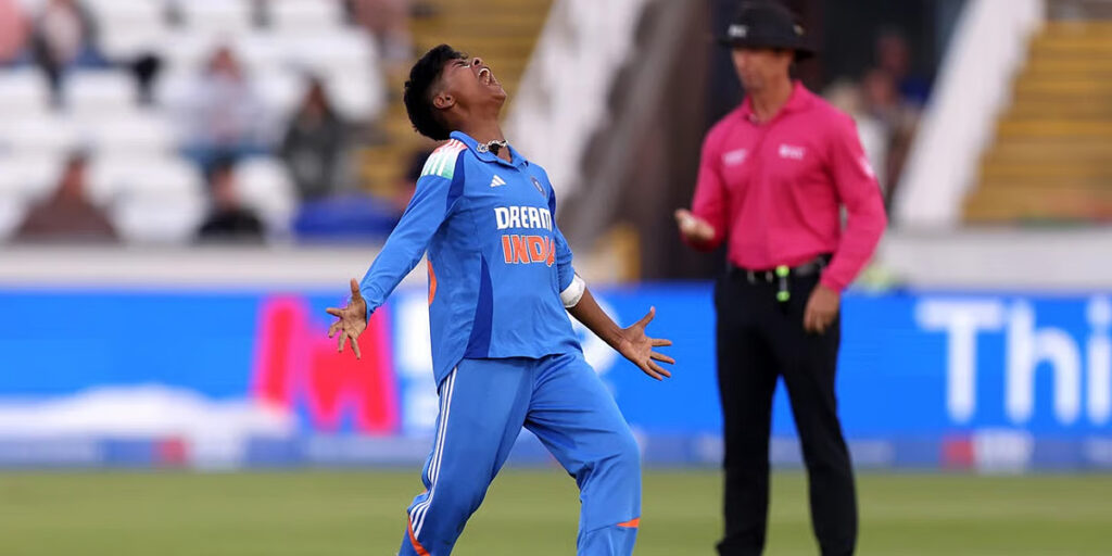 பின்னர், 319 ரன்கள் என்ற கடின இலக்கை எதிர்கொண்ட இங்கிலாந்து, தொடக்கத்திலேயே அதிர்ச்சியை சந்தித்தது. இந்தியாவின் 21 வயதான வேகப்பந்துவீச்சாளர் கிராந்தி கவுட் தனது அதிரடி பந்துவீச்சால் ஆரம்பத்தில் 2 விக்கெட்டுகளை வீழ்த்தி போட்டியின் ஓட்டத்தை இந்தியாவுக்குத் தரப்போல மாற்றினார்.