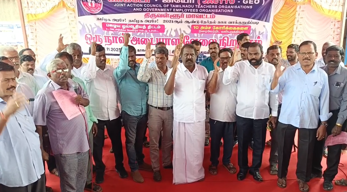 திருவள்ளூர் மாவட்ட அரசு மருத்துவக் கல்லூரி சாலையில் ஜாக்டோ – ஜியோ அமைப்பினர் ஒரு நாள் அடையாள வேலை நிறுத்தப் போராட்டம் மாவட்ட செயலாளர் மணிகண்டன் தலைமையில் நடைபெற்றது. இதில் சிறப்பு அழைப்பாளராக மாநில பொதுச் செயலாளர் இரா.தாஸ் கலந்து கண்ட உரையாற்றினார். இந்த போராட்டத்தில் பழைய ஓய்வூதிய திட்டத்தை உடனடியாக நடைமுறைப்படுத்திட வேண்டும், இடைநிலை ஆசிரியர் ஊதிய முரண்பாடு மற்றும் முதுநிலை அனைத்து நிலை ஆசிரியர்கள் ஊதிய முரண்பாட்டை நீக்க வேண்டும், டெட் தேர்வு ரத்து செய்திட வேண்டும், அரசாணை 243 ரத்து செய்திட வேண்டும், 21 மாத ஊதிய மாற்ற நிலுவைத் தொகையை உடனடியாக வழங்கிட வேண்டும் , சாலை பணியாளர்களின் 41 மாத பணி நீக்க காலத்தினை முறைப்படுத்தி ட வேண்டும், உள்ளிட்ட 10 அம்ச கோரிக்கைகளை வலியுறுத்தி ஒரு நாள் அடையாள வேலைநிறுத்தம் போராட்டத்தில் ஈடுபட்டு வருகின்றனர். சொய்தியாளர்களை சந்தித்த மாநில ஒருங்கிணைப்பாளர் காந்திமதிநாதன் இன்றைய வேலை நிறுத்தப் போராட்டத்தில் ஆசிரியர் மற்றும் அரசு ஊழியர்கள் சுமார் 5 லட்சம் பேர் தமிழ்நாடு முழுக்க இந்த ஒரு நாள் அடையாள வேலை நிறுத்த போராட்டத்தில் பங்கு பெறுவார்கள் என்றும் இந்த போராட்டத்தின் முடிவுக்கு கொண்டு வர தமிழ்நாடு முதலமைச்சர் உடனடியாக கோரிக்கை ஏற்று அறிவிக்க வேண்டும் என அவர் தெரிவித்தார்