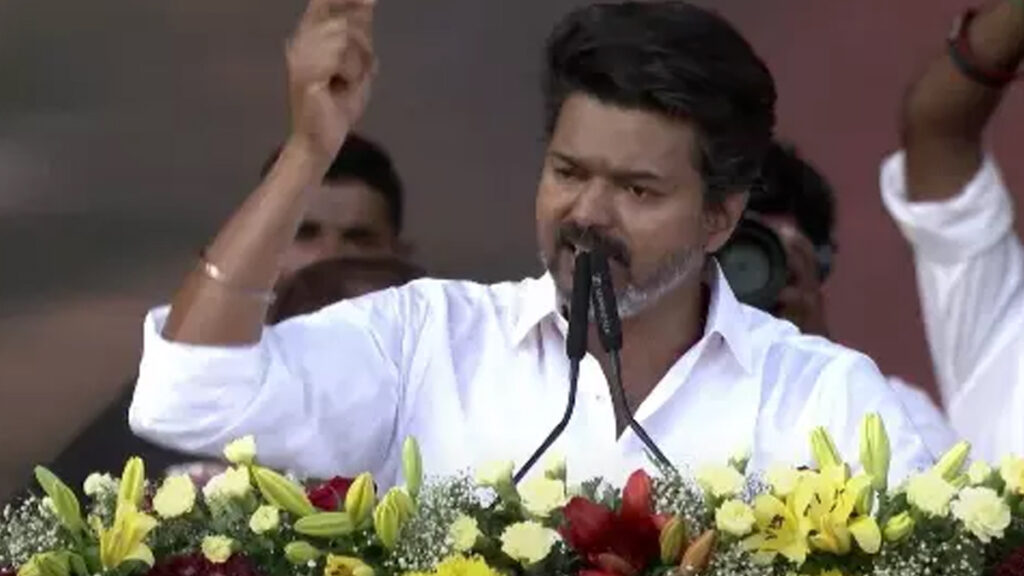 மதுரையில் நடைபெற்ற தவெக 2-வது மாநில மாநாட்டில் அக்கட்சித் தலைவர் விஜய் மிகவும் மாஸாக உரையாற்றினார் அதற்கு மக்கள் ஆரவாரம் செய்தனர்.