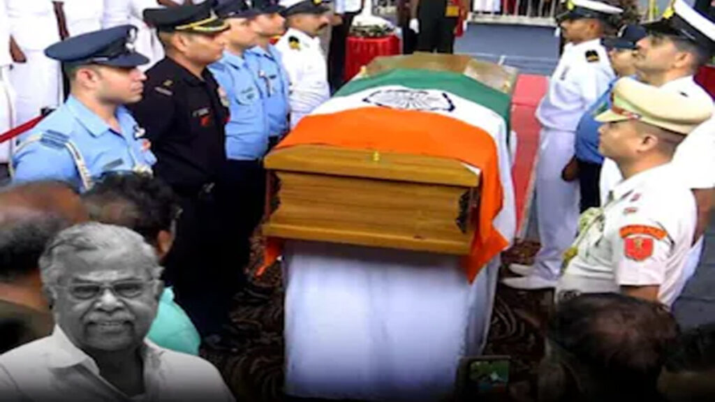 பின்னர், இன்று மாலை பெசன்ட்நகர் மின் மயானத்தில் அரசு மரியாதையுடன் அவரது உடல் தகனம் செய்யப்பட்டது. மூன்று முறை 42 குண்டுகள் முழக்கத்தில் முப்படை வீரர்கள் இறுதி அஞ்சலி செலுத்தினர்.