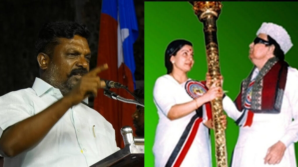 சமீபத்தில் நடந்த ஒரு நிகழ்ச்சியில் திருமாவளவன், “எம்.ஜி.ஆர்., கலைஞர் கருணாநிதிக்கு எதிராக வெறுப்பு அரசியலை விதைத்தார். திராவிட இயக்கத்திற்குள் பார்ப்பனியத்தை ஊடுருவச் செய்வதற்குக் காரணமாக இருந்தார். ஒரு பார்ப்பனப் பெண் திராவிட கட்சியின் தலைவராக அமையப் பாதை போட்டுக் கொடுத்தார்” என பேசியிருந்தார். மேலும், ஜெயலலிதா தன்னை பார்ப்பனப் பெண் என சட்டமன்றத்திலேயே வெளிப்படையாக கூறியதாகவும் அவர் குறிப்பிட்டார்.