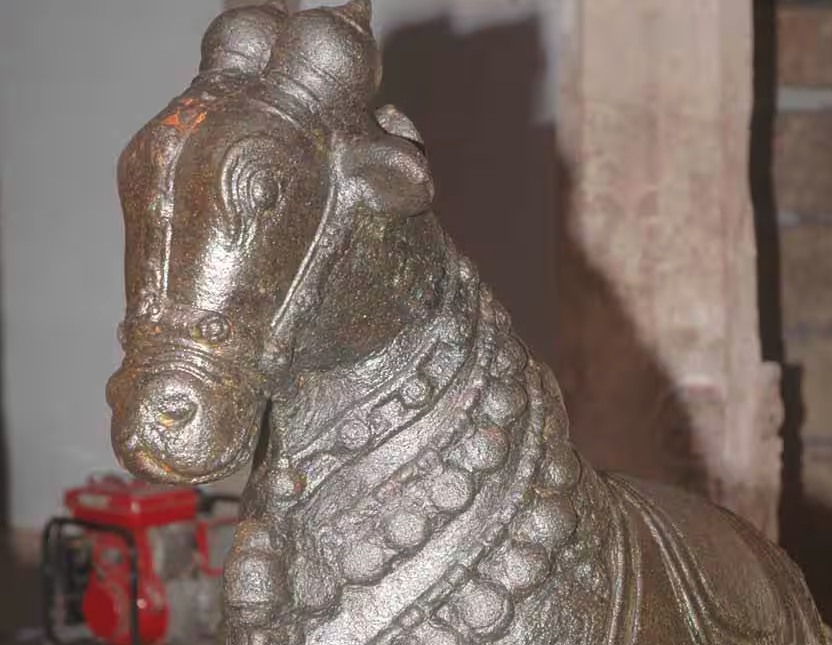 முகத்துடன் இருக்கிறது. மன்னன் மகளின் குதிரை முகம் மாறியபோது, அவளுக்கான முற்பிறவி பாவத்தை இந்த நந்தி ஏற்றுக்கொண்டதாம். எனவே இந்த நந்தி குதிரை முகத்துடன் இருப்பதாக சொல்கிறார்கள்.