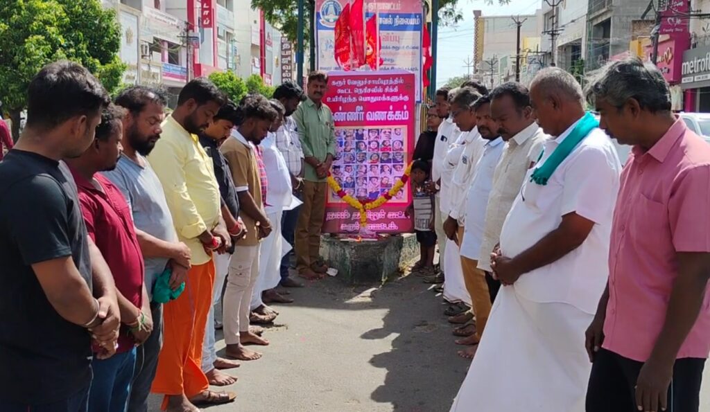 கரூர் பேருந்து நிலையத்தில் நாம் தமிழர் கட்சி சார்பில் வேலுச்சாமி புரத்தில் கடந்த 27ஆம் தேதி அன்று தமிழக வெற்றி கழகத்தின் சார்பில் மக்கள் சந்திப்பு பிரச்சாரம் நடைபெற்றது அப்பொழுது கூட்ட நெரிசலில் சிக்கி 41 பேர் உயிரிழந்த நிலையில் அவர்களின் புகைப்படத்திற்கு மாநில வழக்கறிஞர் பாசறை செயலாளர் செல்வ நன்மாறன் தலைமையில் மலர் தூவி மௌன அஞ்சலி செலுத்தினர்.