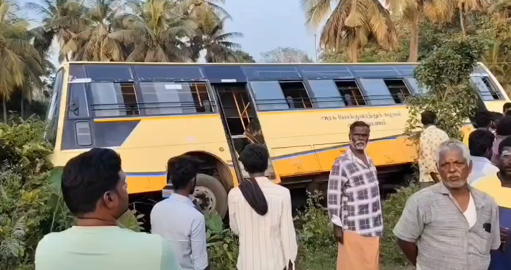 திருவாரூர் மாவட்டம், நன்னிலம் பேருந்து நிலையத்திலிருந்து வேலூருக்கு அரசு பேருந்து ஒன்று சென்றுள்ளது. இந்த அரசு பேருந்து நன்னிலம் அருகே அச்சுதமங்கலம் என்ற பகுதியில் கடந்து சென்ற பொழுது.. தடுமாறி கட்டுப்பாட்டை இழந்து சாலை ஓரத்தில் உள்ள வாய்க்கால் சுவரின் மீது