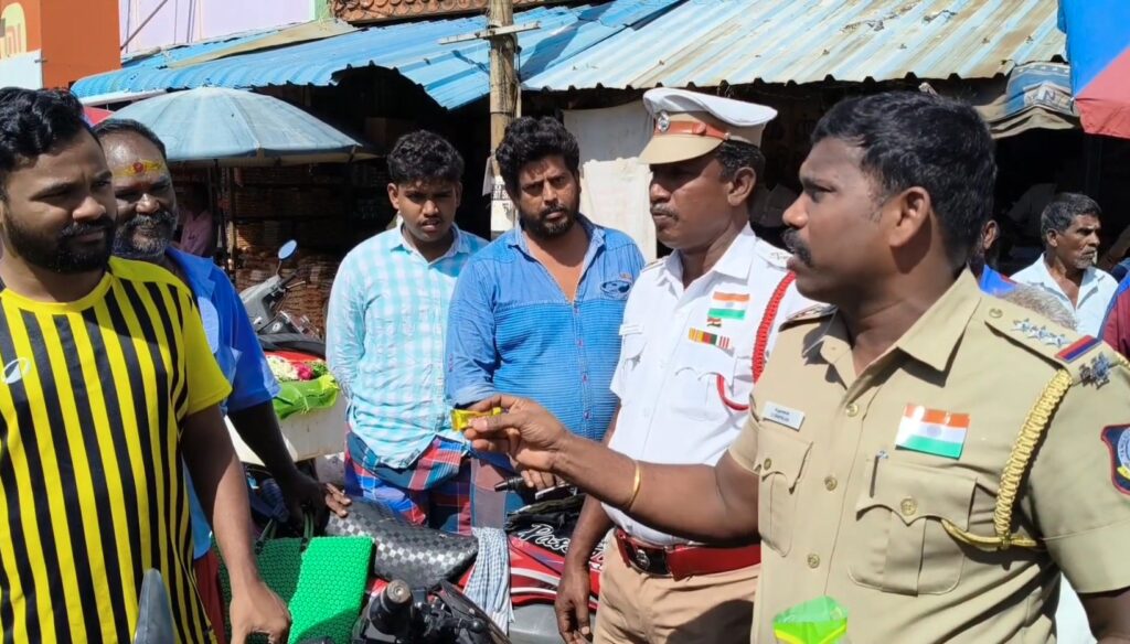 தொடர்ந்து அந்த வழியாக ஹெல்மெட் அணியாமல் வந்த இருசக்கர வாகன ஓட்டிகளை நிறுத்தி இன்று சுதந்திர தினம் என்பதால் அபராதம் விதிக்கவில்லை இனிமேல் ஹெல்மெட் அணிந்து தான் வரவேண்டும் ஹெல்மெட் அணிந்தால் தான் எந்த ஒரு விபத்தையும் தவிர்க்கலாம் உங்கள் உயிர் உங்களின் குடும்பத்திற்கு முக்கியம் என விழிப்புணர்வை ஏற்படுத்தி காவல் ஆய்வாளர் தயாளன் இனிப்புகளை வழங்கினார்.